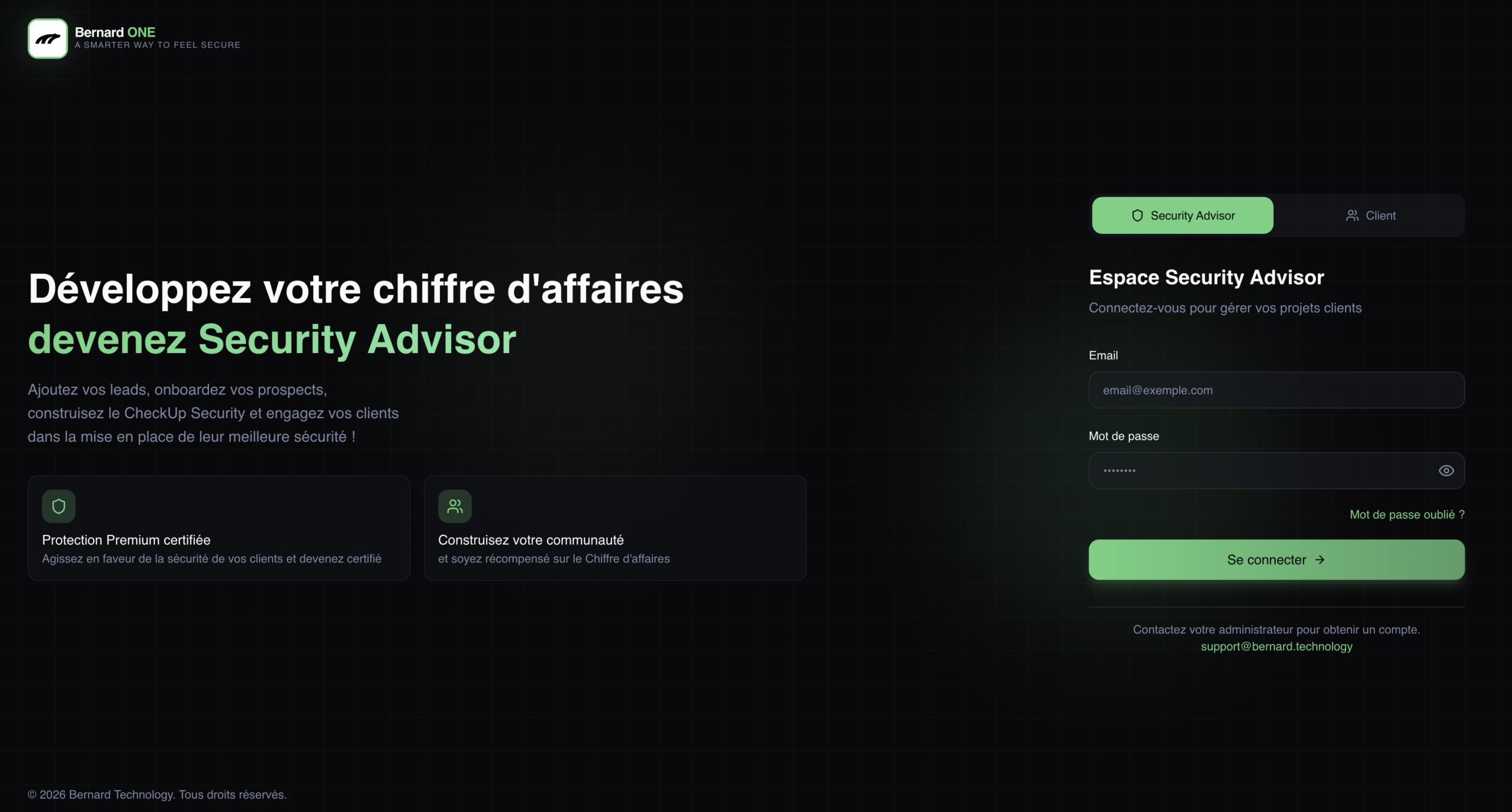 • Accès à la plateforme Bernard ONE ( projets, données, reporting, CheckUP Security)